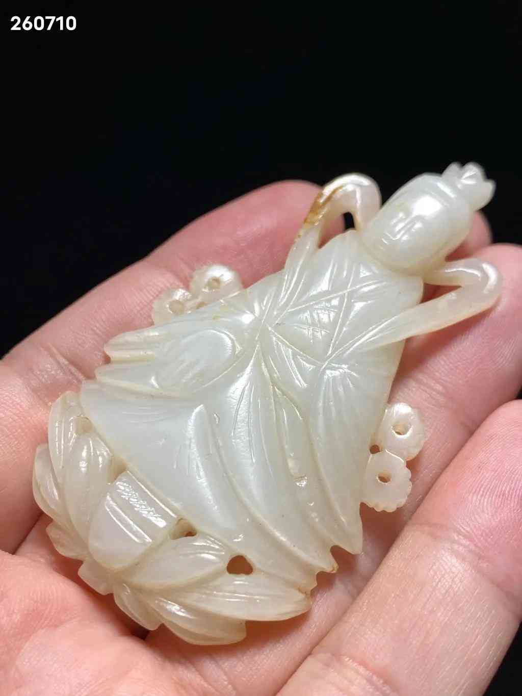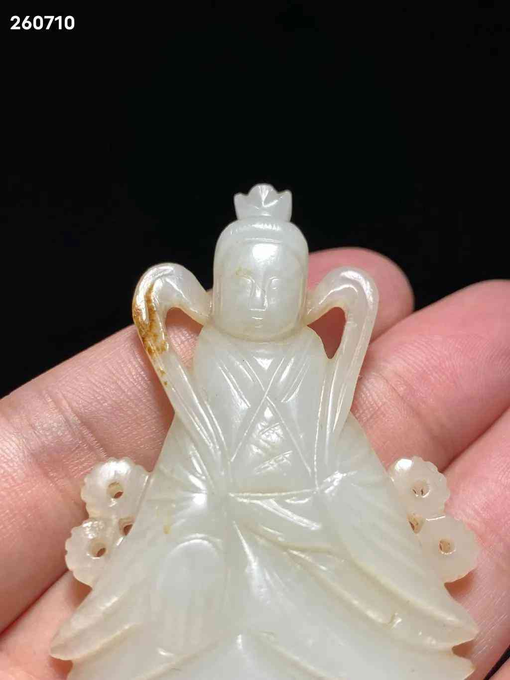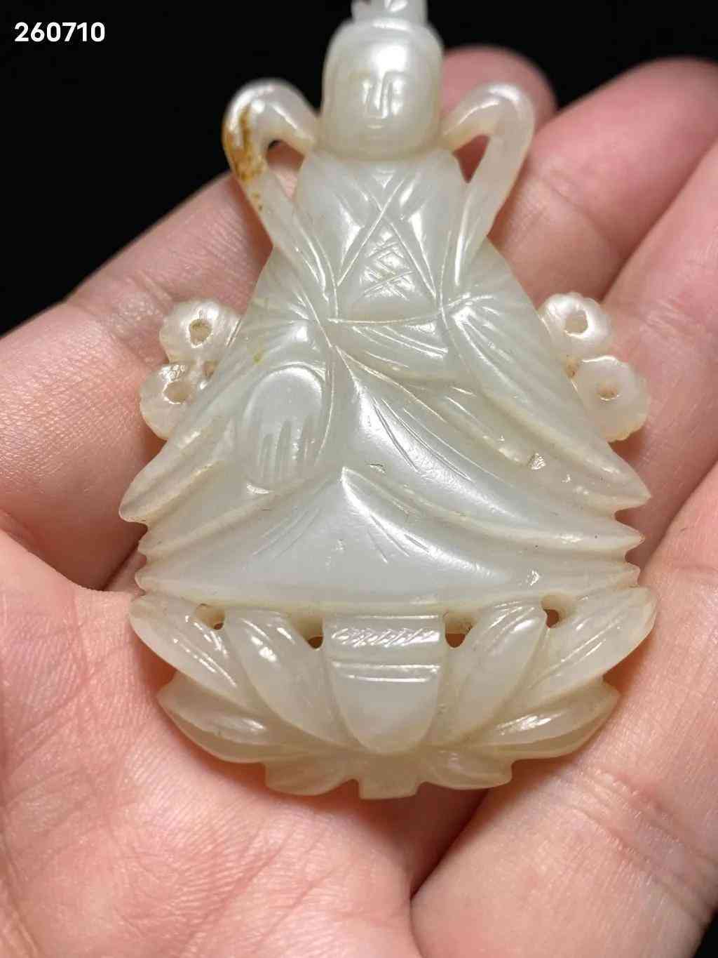 明 和田玉籽料 白玉 玉莲花座佛 玉观音 挂件:长:4.2 宽:0.8 高:7.2 厘米 重:35克 玉质洁白温润,质地精良,包浆自然古朴。观音大士结跏趺而坐于莲台之上,头梳高髻,饰以环饰,为唐代流行之发式,身穿交襟及地长袍,宽水袖过膝,右手当胸结说法印,衣饰皱褶描摹细致,垂坠感立体。面额饱满,连眉直鼻,双目低垂,静妙端庄,面部安静慈祥,眉间白毫相表示佛光普照三千大千世界。玉质青白,佛像发髻高耸,头戴宝冠,面相庄严,结禅定印,全跏趺坐于莲座之上。此件造型玲珑精巧,刻画细腻生动,形神兼备,包浆古旧,佩及于身,福佑安康。