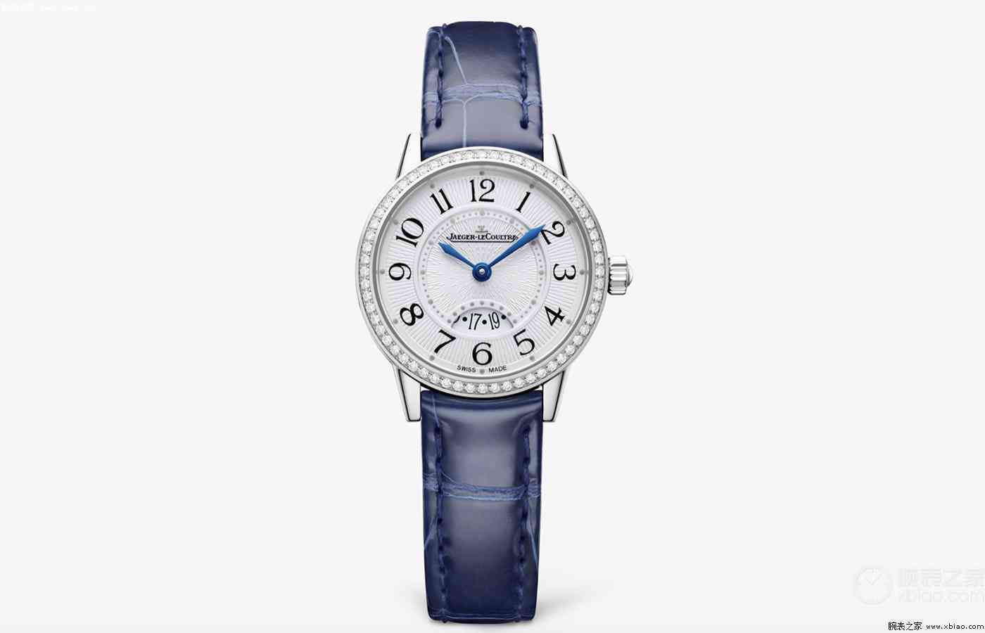 腕表点评:积家约会系列是少有的为女性设计的腕表系列,这只腕表颜值很高,蓝色和银色的搭配很高级。腕表直径29毫米,精钢材质打造表壳,表圈上镶嵌了60颗钻石(约0.42克拉),表盘设计的也很漂亮,扭索饰纹, 黑色移印数字,花形指针,都彰显着积家约会独特的辨识度。在表盘下方,开设了一个日期显示窗口,它的形状设计的很独特,像一片叶子。配备一根蓝色鳄鱼皮表带,搭载一枚石英机芯,对女孩子来说足够方便,腕表防水30米。