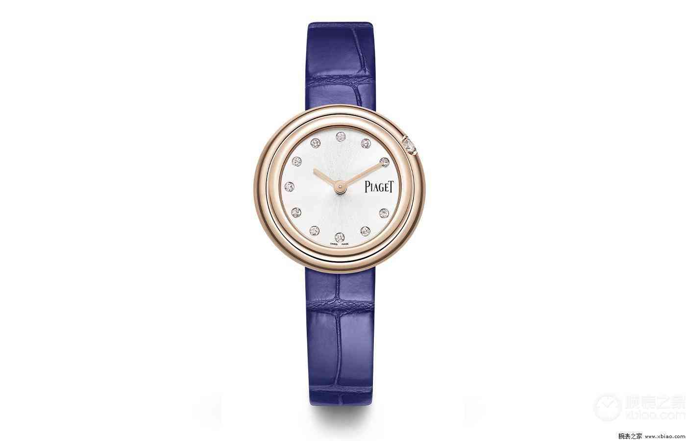 腕表点评:伯爵腕表的logo是很容易辨认的,这只腕表直径29毫米,18k玫瑰金材质打造表壳,在表壳的右上方,镶饰了1颗明亮切割式钻石(重约0.05克拉),腕表表盘上镶饰了11枚钻石时标(重约0.07克拉),这只腕表的设计风格,让其无论是作为珠宝或者腕表来佩戴都是很合适的,并且受到女性的欢迎。品牌为腕表配备了一只短吻鳄皮可替换表带,并搭载一枚石英机芯,腕表防水30米。