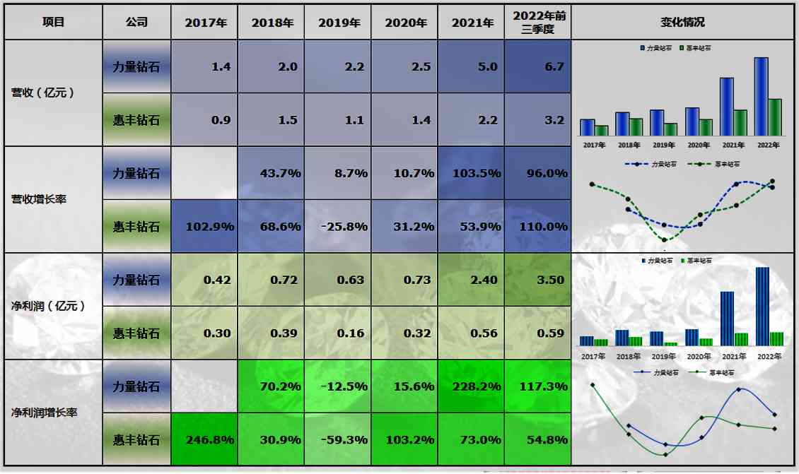 力量钻石从2017年的1.4亿元的营收,到2021年增长了2倍多,2022年前三季度,同比有接近翻倍的增长。惠丰钻石从2017年的不到1亿元的营收,到2021年2.2亿元,增长了1倍多,2022年前三季度同比有翻倍不止的增长。但是两家的规模都还不能算大,现在人造钻石的价格已经是天然钻石的三分之一,甚至更低了。或许随着技术的成熟,这类本来就不太大的需求,在竞争下价格还会下跌,其后续增长情况还不好说。