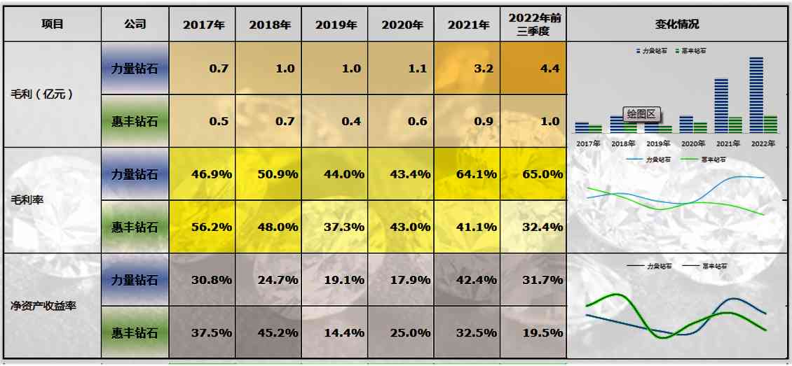 其实差异就在毛利率的变化方面,2017年时,惠丰钻石的毛利率达到了56.2%,超过了力量钻石;但是力量钻石通过发展中的调整,2021年就达到了64.1%,2022年前三季度提升至了65%,而惠丰钻石的毛利率却下降明显,2022年前三季度,只有力量钻石的一半左右了。