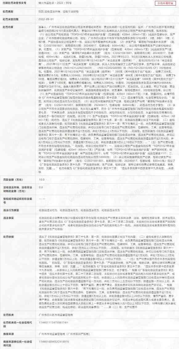 此外,广州市白云区市场监督管理局公布的行政处罚决定书(穗云市监处字﹝2022﹞430号)显示,广州市采洁化妆品有限公司因存在化妆品违法行为被广州市白云区市场监督管理局罚款1.1万元,没收违法所得、没收非法财物的金额2200元,处罚决定日期2022年7月6日。