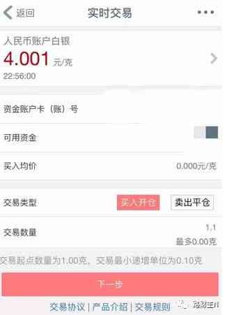 有三个方式买入纸白银:分别是:实时、挂单和定投(真的蛮人性的呀)。根据自己的需求选择交易方式,如果现在就想要买入,那就选“实时”、交易类型是“买入开仓”(反之,要获利卖出就选择“卖出平仓”),输入交易数量,最少买1g,可以以0.1g递增。
