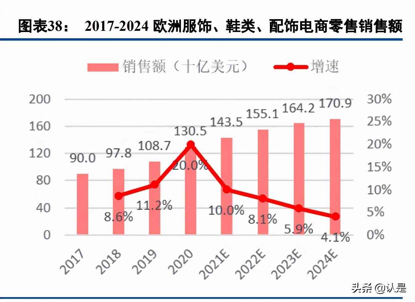海外电商服饰赛道规模大增速快,疫情催化服饰类电商渗透率提升。近年来海外电商服饰类赛道规模增长 迅速,市场空间广阔,逐渐成为跨境电商出海的重要赛道。根据 Statista 数据,在美国及欧洲市场,2020 年服 饰、鞋类、配饰电商零售销售额分别达到了 1106 亿美元、1305 亿美元,2017-2020 CAGR 分别达 12.7%、13.2%, 预计到 2024 年,美国、欧洲市场的服饰、鞋类、配饰电商零售销售额将增至 1536 亿美元、1709 亿美元,随着 电商渗透率的不断提升以及消费者购物方式的改变,预计海外服饰类电商市场规模将进一步扩大。2020 年疫情 期间,服饰类电商获得显著流量红利,以美国为例,2019-2020 年间,服装服饰及鞋业电商渗透率提升近 10%, 仅次于家用消费电子提升值。到 2020 年,美国服装服饰及鞋业电商渗透率已接近 30%,高于美国平均电商渗透 率(18%),仅次于家用电器、手机以及消费电子的电商渗透率。
