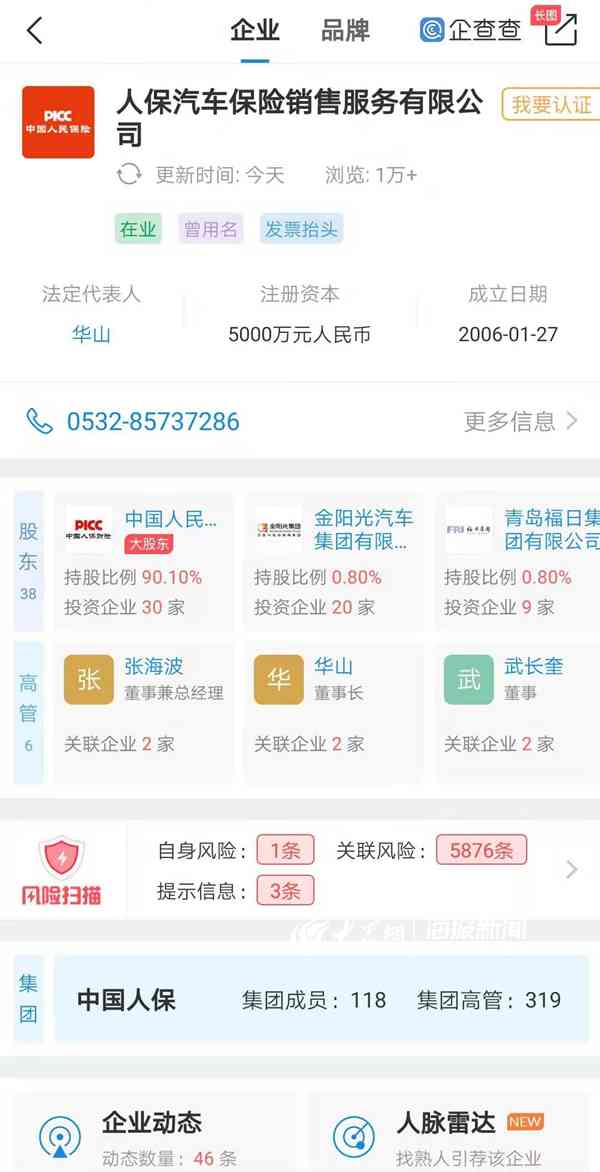 记者通过企查查平台查询了解,“人保车险”黑龙江分公司隶属于人保汽车保险销售服务有限公司,总公司的法定代表人为华山,神州优车董事,现为中国人保财产险执行副总裁,兼任人保汽车保险销售服务有限公司董事长。而人保汽车保险销售服务有限公司的大股东为中国人民财产保险股份有限公司,持股比例为90.10%。