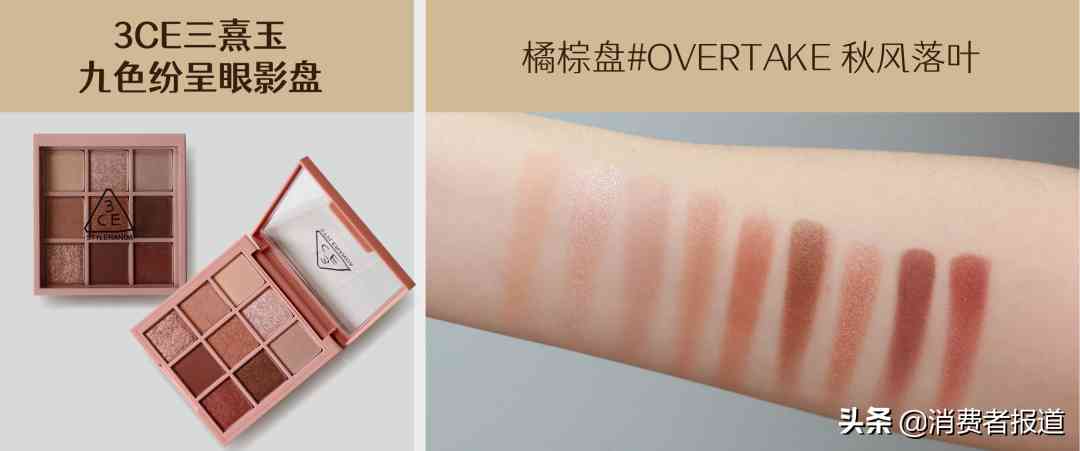 Overtake经典橘棕盘是3CE家最火的一个眼影盘,大地色系眼影盘中的常青树,9种同色系完全和谐,不挑人好上手。显色度不错,粉质也比较细腻,但细闪容易飞粉。