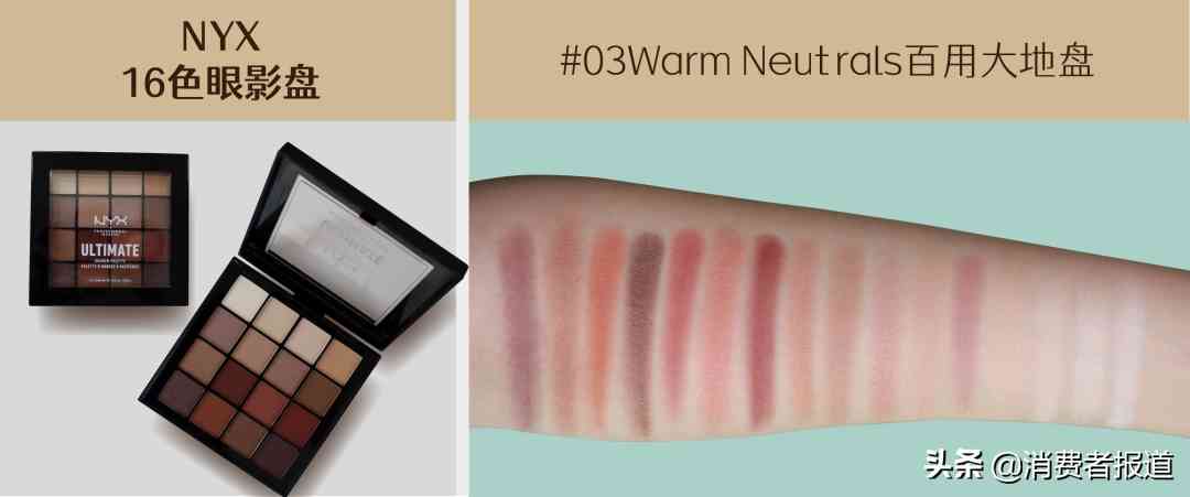 NYX这盘16色眼影,算是大地色系中的扛把子,使用率很高。