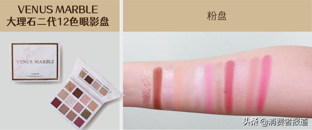 这款眼影包含了9种颜色,里面粉色闪片上手偏紫,哑光深色在眼尾卡成一坨,稍显突兀。粉质较为粗糙,手臂试色延展性一般,有结块、颜色不均匀的情况。模特的评价是上眼晕染效果一般,深色不好晕开。