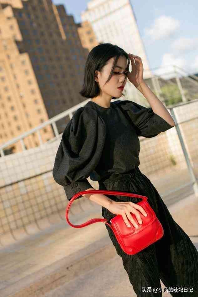 黑色是最显瘦的颜色,自身有很好的收缩感,从视觉上缩紧全身,但一身黑很难穿出时髦感,整体偏暗沉,看着就压抑。但这组穿搭中选择了一个正红色的方形包,利用饱和度极高的红色营造亮点,瞬间打破黑色的单调与呆板。另一方面,真皮材质的方形包与棉麻材质的衣服在面料上形成对比,软硬结合,更显高级大气。