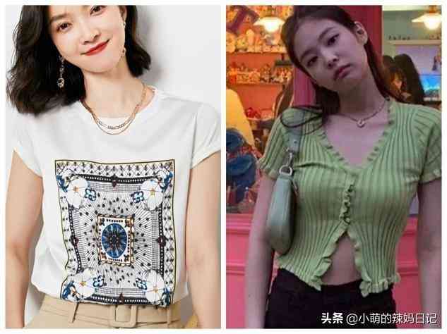 缎面不但有光泽,摸起来顺滑,具有一定的垂感,穿起来与针织面料紧绷在身上的感觉是完全不一样的,优雅、知性、气质,从风格调性上看就与众不同。左图与右图都是今年比较火的短袖款式,但缎面带有印花图案的穿起来比右图针织短袖高级很多。