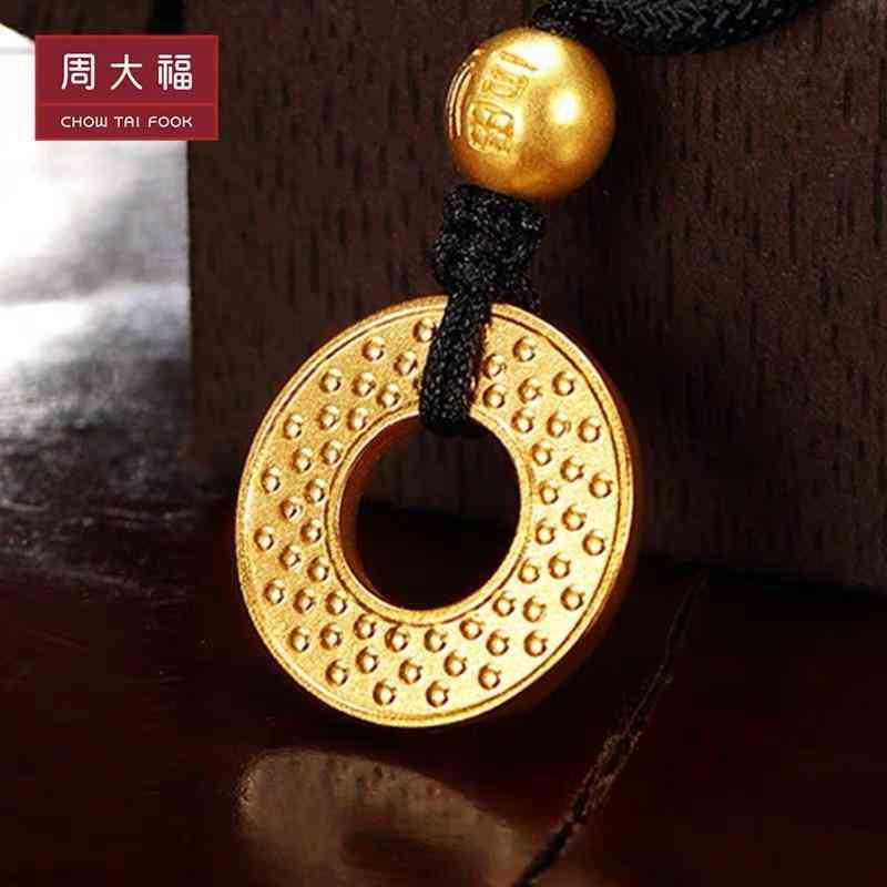 周大福祥瑞祈福古法黄金足金吊坠,灵感来源于玉瑗,瑗代表有贵人相助,前程似锦,内外两圆,圆满之意。内圆代表内心严于律己,外圆代表天地、包容、宽以待人。产品经过古法加工,无打磨抛光痕迹,一款怀揣温情的首饰,韵味十足。