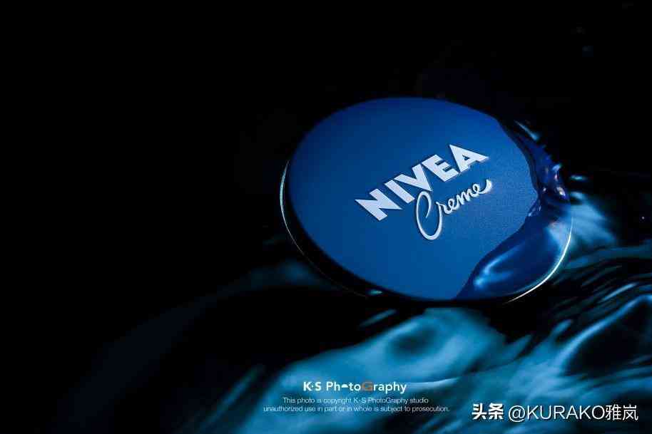 在自然界中,蓝色的元素有夜空,海洋,尤其是夜晚的海面,更是给人一种宁静的神秘感。所以.个拍摄案例,我选定的主体是化妆品中和Classic Blue最接近的NIVEA品牌。产品买回来的时候,盒子表面带有强烈的反光,用“技术手段”处理了一下,做成了这样磨砂的质感,也更加贴合我想表现的静谧氛围。因为布景里有用到水,所以我用了一个透明亚克力浅水缸,在底下放置一块黑色的植绒布,这样就做出了黑色的背景。加入没过主体1/3的水,这里注意水位不能太低,要不然水会盖不到主体上,效果没有那么好哈。然后主体背后用蓝丁胶垫起来~让主体更加有立体感