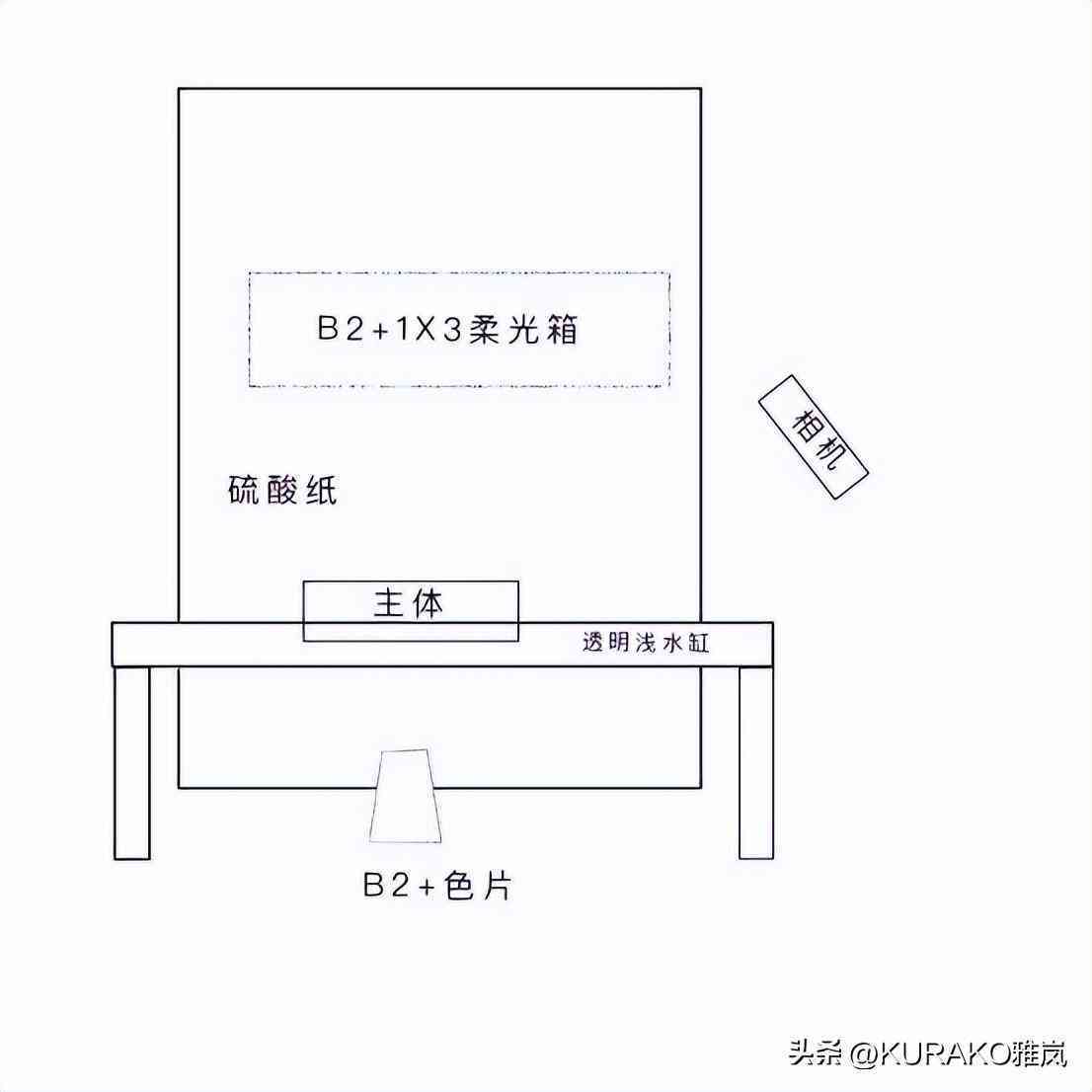 布光上用了两支灯,一支裸灯加上蓝色色片,从板子背后打上来,另外一支灯在主体右侧,是一支加了1X3条形柔光箱的B2,前面再加一层硫酸纸。
