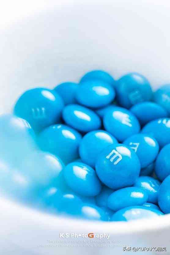 比如这张M豆,就是我从两袋糖果中挑选出来的,我觉得蓝色和白色搭配会很好看,所以找了一个白色的碗来装它,光线上我想要一个明亮柔和的效果,于是用了裸灯+硫酸纸的布光方式。我想让画面更有层次感,所以在镜头前面加了一张蓝色透明的糖纸做前景,最后得到来这张梦幻柔美的照片。