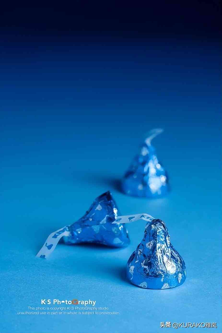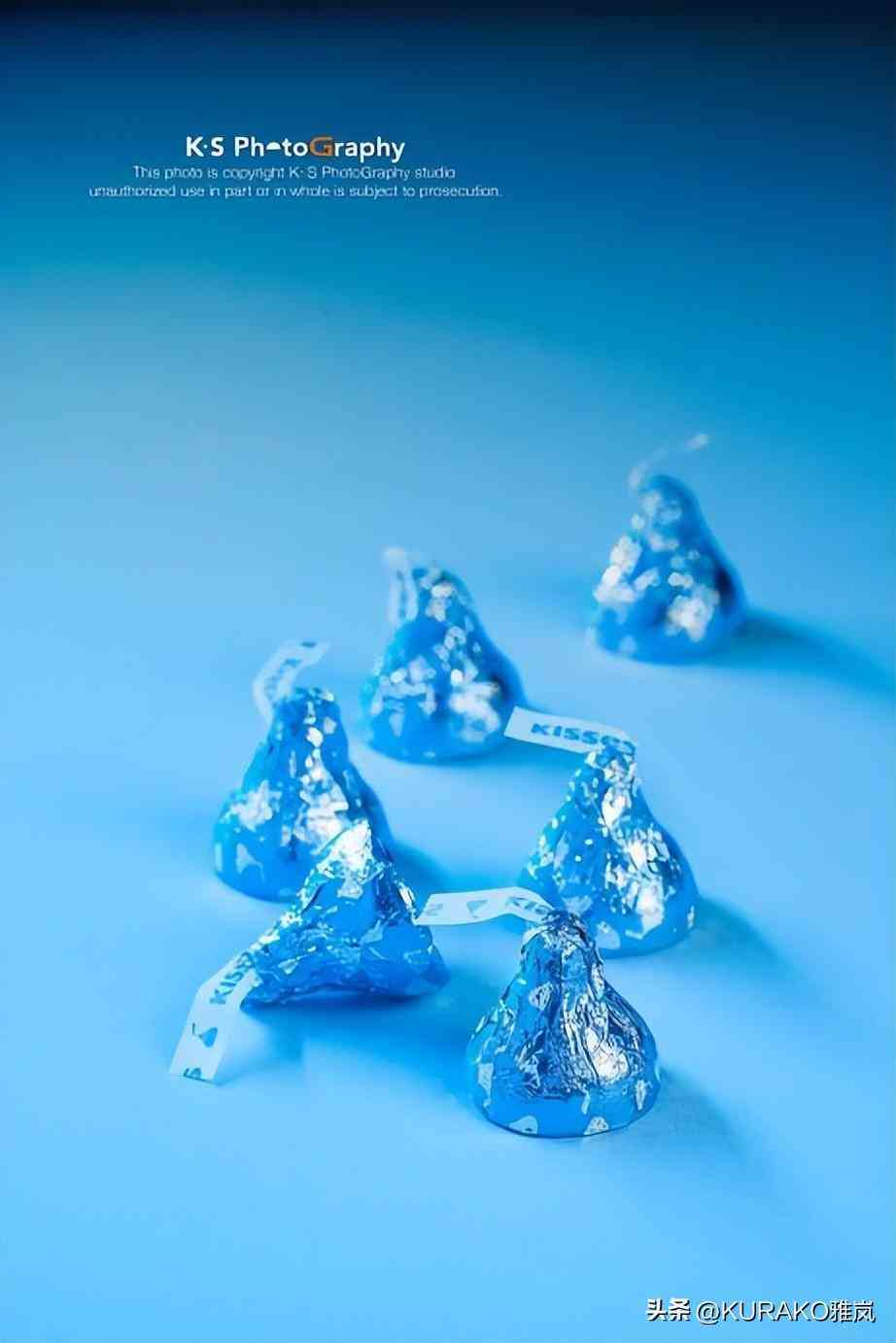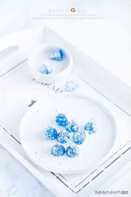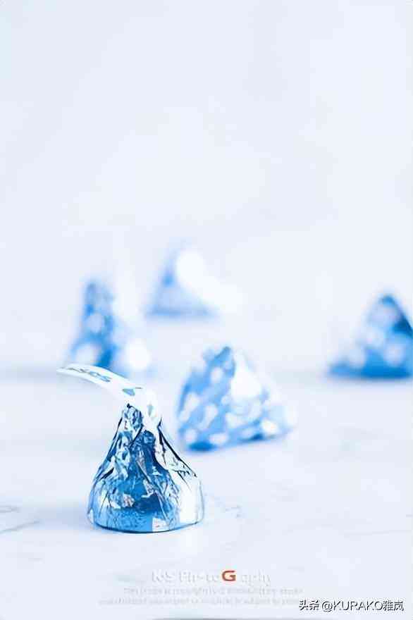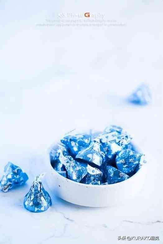 同样蓝色的主体还有好时KISSES巧克力,单独拿出来放在浅色大理石纹理的背景上拍一张~~