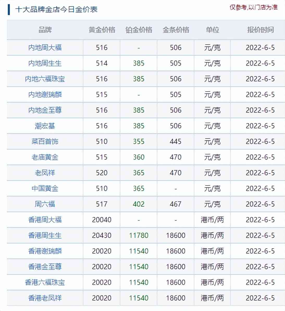 国内十大金店价格:周大福今日金价516元/克,六福黄金今天交易价516元/克,周生生今日金价514元/克,金至尊黄金金价今日价格516元/克,谢瑞麟今天金价514元/克,老凤祥今日黄金价格520元/克,老庙黄金价格515元/克,菜百今日金价510元/克,周大生黄金现在价钱516元/克,中国黄金999黄金价格元/克,金大福黄金价格今日.价511元/克,潮宏基黄金报价516元/克,周六福金价今日价格517元/克。
