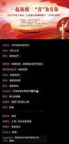 同时,上海市三八红旗手联谊会联合上海音乐学院开设“一起抗疫,‘音’为有你”线上音乐疗愈课,上海市女性身心健康发展中心也将推出心理直播课。优美的音乐作品和心理疏导课程让居家的全市居民,尤其是老人、孩子们释放身心,安心抗疫。