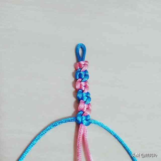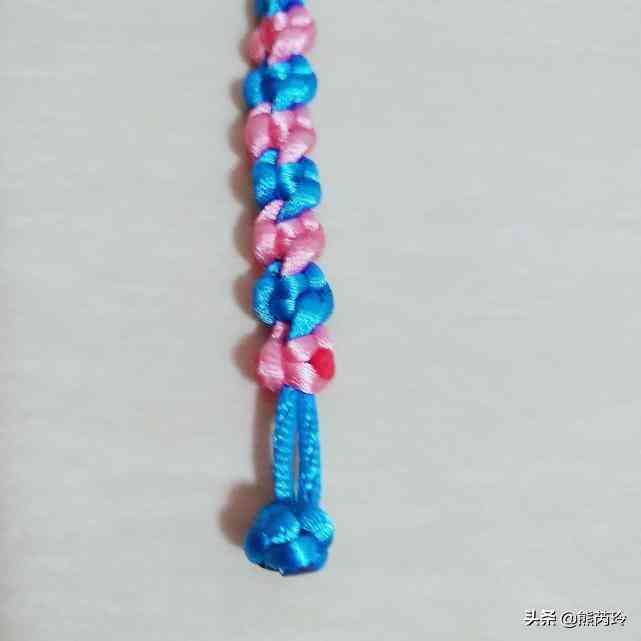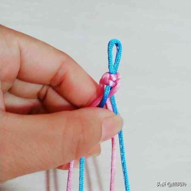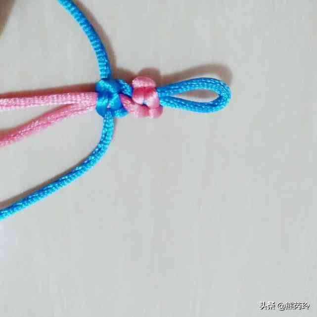 第2步,把粉色的线,左边的从蓝线中间下面穿上来,右边的从蓝线中间穿到下面,压在左边的线上面,如下面图片。
