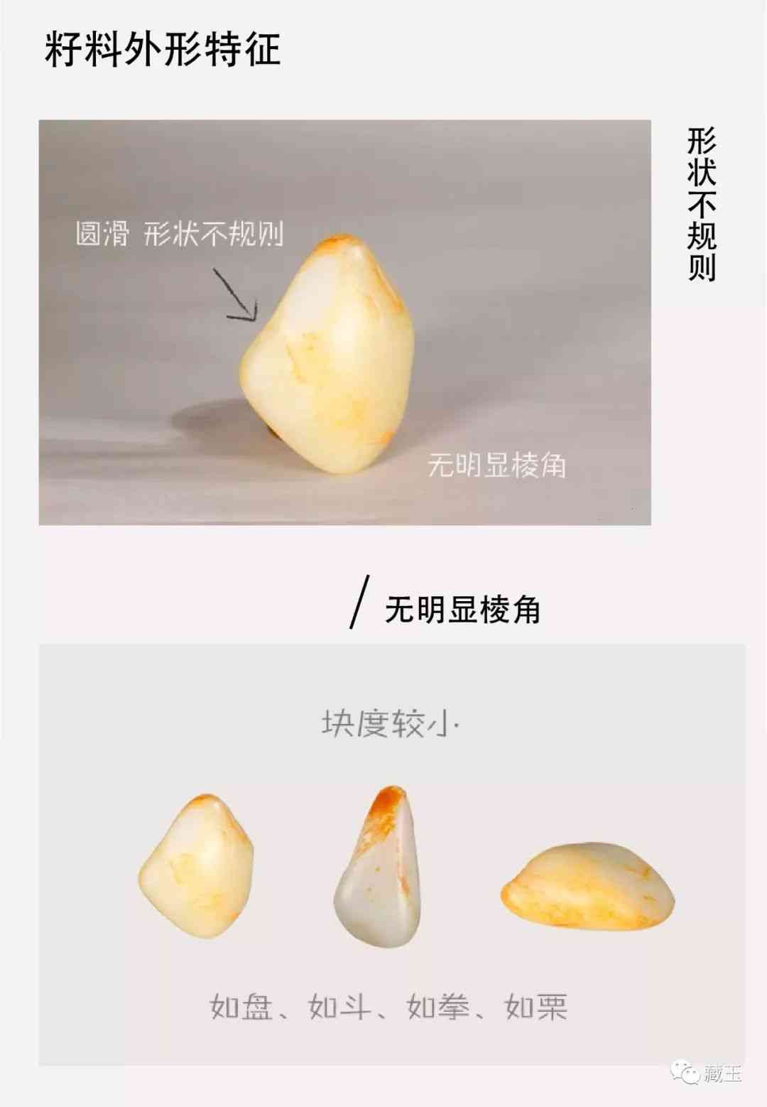 “世界上没有两片完全相同的树叶”,自然也没有完全相同的两块籽料。天然的籽料,形状各不相同,且无明显棱角。