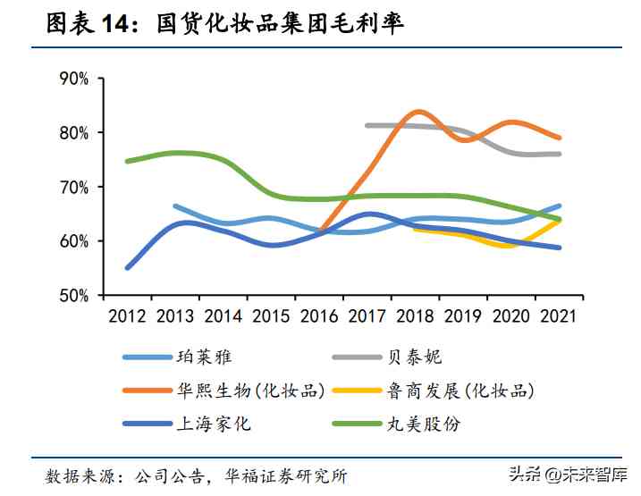 从产业链价值分布来看,中游品牌商占据话语权,长期积累以及全方位能力打造 的品牌力支撑品牌商具有产业链环节中最高的毛利率。结合各公司财报,化妆品产业 链上游环节毛利率为 25%-40%,而在透明质酸领域具有绝对优势的华熙生物原料业 务部分的毛利率可高达 70%以上。代工环节加价率较低,毛利率范围在 25%-30%。 中游品牌商毛利率和加价率均较高,毛利率可高达 60%-80%,产品、渠道、营销等 全方位长期积累的品牌力为化妆品品牌商带来溢价能力和定价权。