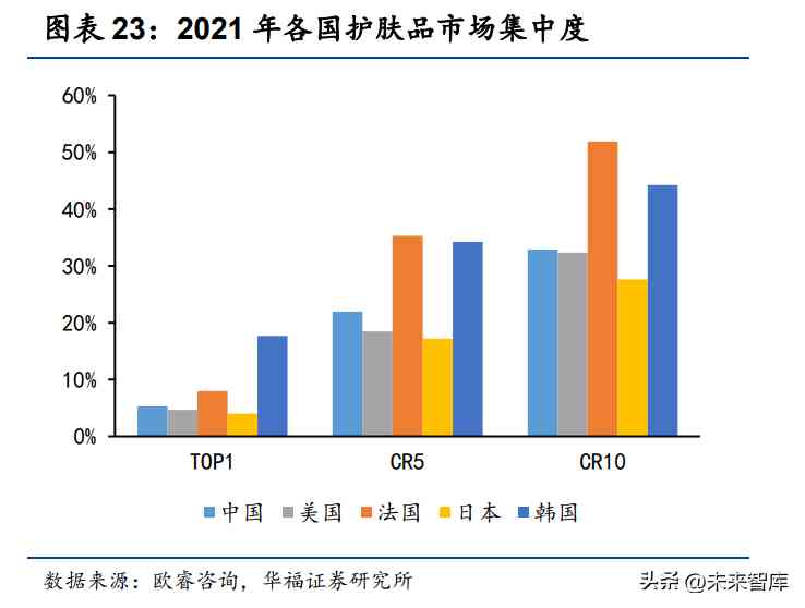 彩妆行业同样可以看到成熟市场头部品牌多由本土品牌构成,2021 年美国、日 本 TOP15 彩妆品牌中,本土品牌分别有 11 个、14 个,而中国市场本土品牌仅占 4 个。对比 2012 和 2021 年中国彩妆市场,TOP2 由外资品牌美宝莲、欧莱雅占据主要份额转变为国货花西子、完美日记位居前二,国产品牌产品力明显提升。2012-2021 年中国彩妆行业市场集中度降幅明显,国产彩妆品牌百花齐放打破 国际彩妆的垄断格局。2012 年中国彩妆市场 TOP1 市占率/CR5/CR10 分别为 21.2%/44.4%/54.9%,2021 年分别降低至 6.8%/30.3%/48.1%。横向五国对比中, 中国彩妆市场集中度仅次于法国,花西子、完美日记等新锐品牌爆发引领彩妆审美的 国潮崛起。