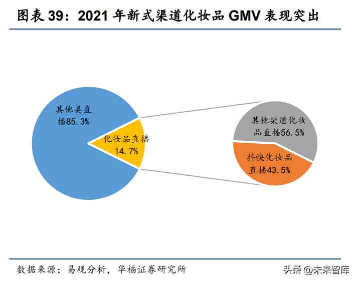 销售向线上和专业渠道转移,新式渠道迅速发展。近十年化妆品行业销售渠道逐 步由线下转移至线上,互联网红利助力电商渠道崛起,2010-2021 年,化妆品行业电 商渠道销售占比由 3%逐年提升至 33%,已成为.大渠道;KA(商超渠道)、百货 等传统渠道销售占比下降较快,线下渠道中仅 CS(化妆品专营店)的占比呈增长态 势。同时,近年来新网络购物模式和新兴平台起势,社交电商、短视频、直播电商等 新线上渠道涌现,抖音、快手等直播电商成为爆发较快的新增长点。根据易观分析的 数据,2021 年,化妆品类直播的 GMV 达到 2000 亿元,在整体直播 GMV 中占比 14.7%;其中抖音、快手化妆品直播销售额为 870 亿元,在化妆品直播中占比高达 43.5%。
