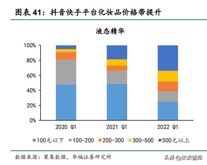 抖快平台结构优化,产品价格带上行趋势明显。渠道拓展过程中要跟踪不同平台 的产品价格结构,化妆品品牌在进入新渠道时往往先通过较为成熟且价格较低的产品 入手,以匹配平台用户契合度,逐渐培养品牌在该平台的消费者心智后,产品侧重向 高毛利的贵价产品转变,从而拉升新渠道的盈利能力。抖音快手渠道逐渐从新兴性价 比平台向主力产品销售平台发展,已经成为头部化妆品品牌的兵家必争之地, 2020Q1-2022Q1,抖音快手平台 500 元以上的液态精华占比由 5%提升至 34%,500 元以上的乳液/面霜占比由 7%提升至 31%,整体产品价格水平上移。