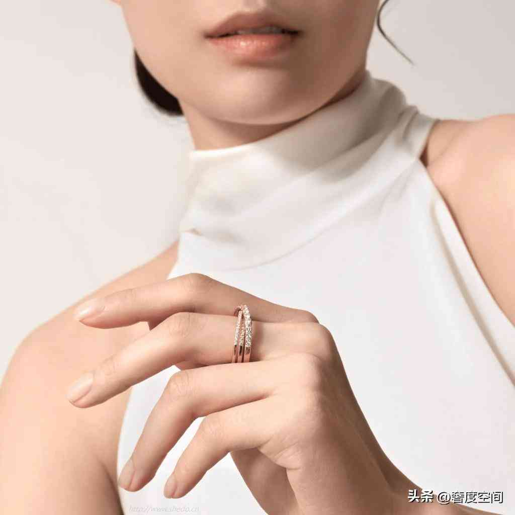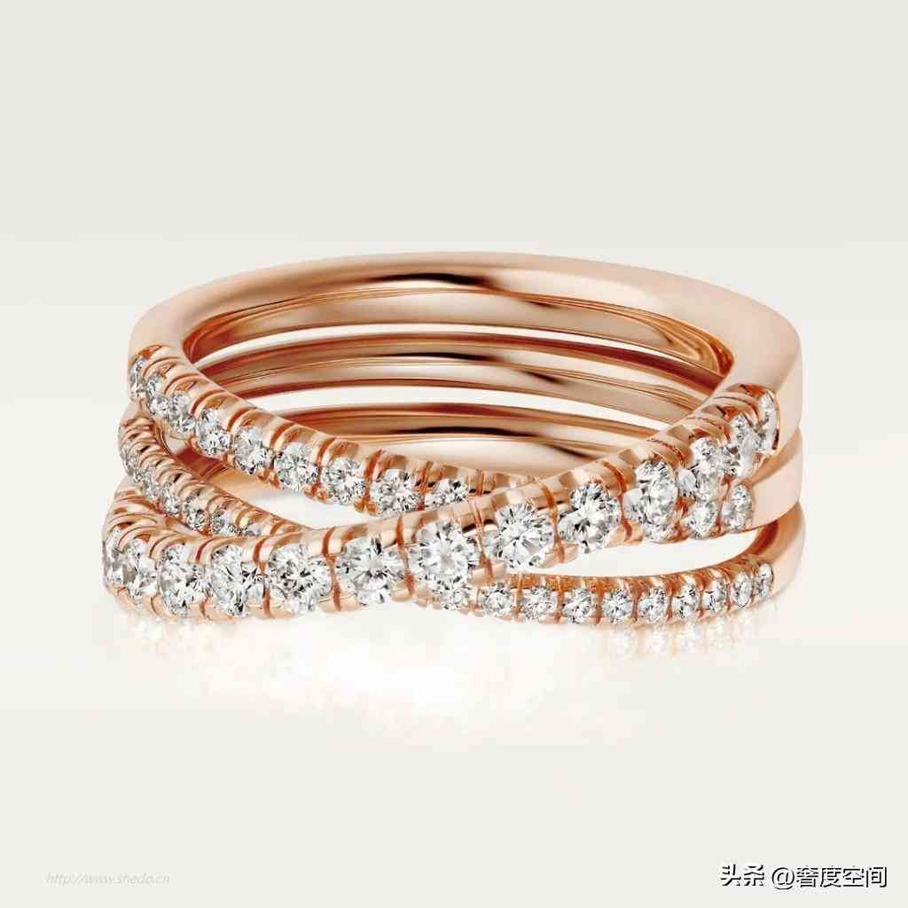 Etincelle de Cartier 戒指, 使用18K 玫瑰金,铺镶 52 颗总重 0.81 克拉的明亮式切割钻石。宽度:6.93 毫米。经典的钻石戒指是镶有闪亮密钉钻石的半永恒戒指,其中有三个不同厚度、动态链接的圆环。立体的轮廓和钻石的耀眼光芒营造出庄严而永恒的优雅。