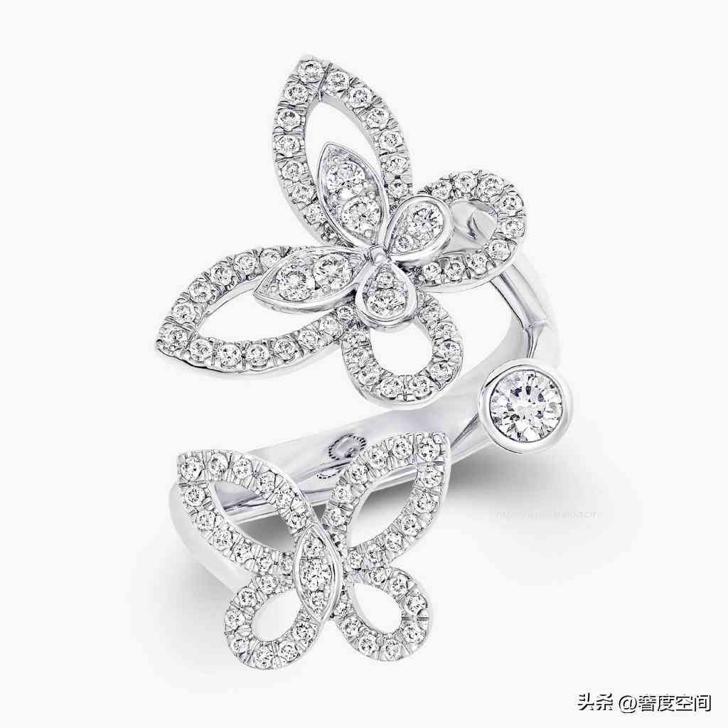 这款蝴蝶剪影白金钻石戒指旨在给人留下两只钻石蝴蝶瞬间落在手指上的感觉,是Graff迷人的标志性图案的现代表现。这枚优雅的戒指饰有一对环绕手指的优雅蝴蝶,每只翅膀的轮廓均以密钉钻石精心描绘,角度柔和,捕捉到微妙的立体感和动感。是一款适合日常佩戴的优雅设计。