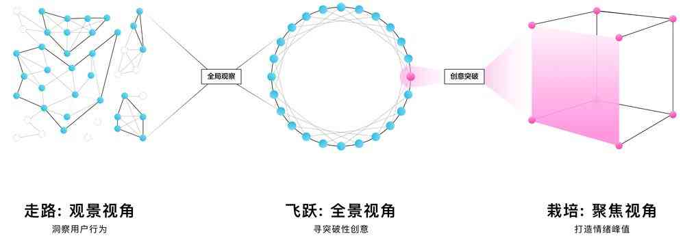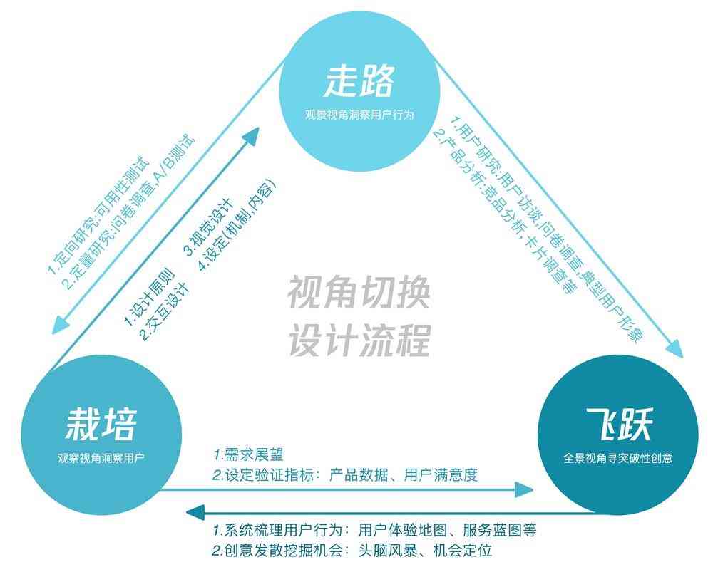 设计中的三种视角走路——观景视角洞察用户行为飞跃——全景视角寻突破性创意栽培——聚焦视角打造情绪峰值再次飞跃——细分目标评估设计视角切换设计流程的量化走路、飞跃、栽培是该设计流程中不断切换的视角的形象化比喻。