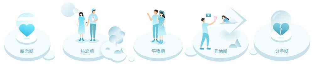 带着这些疑问我们展开了用户研究。我们访谈对象没有局限于正在使用情侣空间的用户,而是将用户群体扩大与细化,形成了以下5个阶段的爱情用户:
