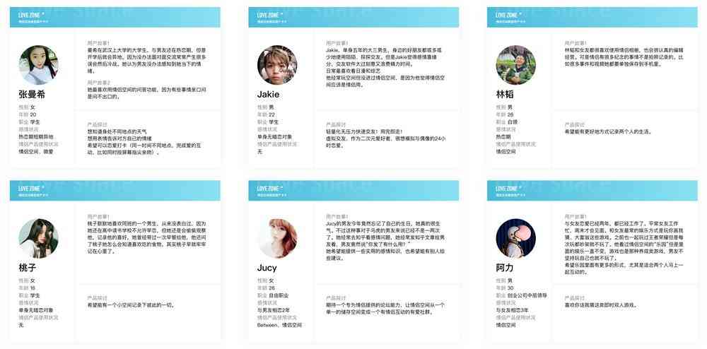 我们将用户案例收集,建立以下典型用户卡片,这些卡片呈现了典型情侣用户形象与他们使用产品的痛点、对产品的期望: