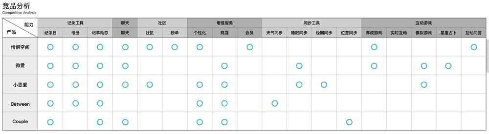 通过竞品分析,可以看到情侣空间基础能力丰富,社交能力强大,但在同步状态、趣味互动等特色能力与竞品相比能力薄弱。