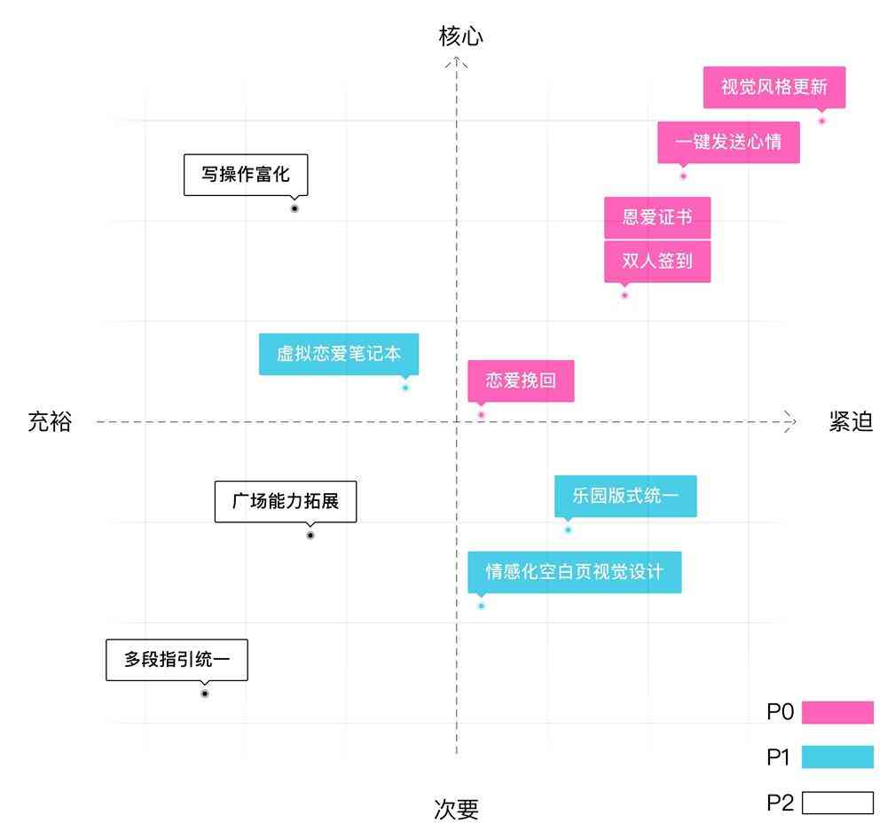 提升用户量、活跃度:AI虚拟暗恋笔记本、双人签到、恩爱证书、一键心情、纪念日视频、恩爱问答。提升付费转化率:写操作形式富化、恩爱证书升级、双人签到补签。减少用户流失:恋爱挽回。拓展多维高价增值服务:实体恋爱纪念册。视觉体验优化:视觉风格更新、乐园版式统一、空白页情感化设计、多端指引统一。针对新的产品机会,要通过需求矩阵对机会点进行定位,决定优先级。
