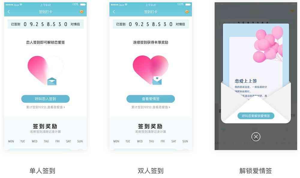 一方签到可通过系统提醒另一方签到。(目标渐进效应增强动机)如果两人一起签到,不仅会获得奖励加倍,还有心形完整点亮成的惊喜交互,并揭秘当天写有寄语的「爱情签」。除此之外积分计入恩爱榜,连续七天可获特殊奖励。(多变酬赏激发使用欲)实时查看全网签到数、查看好友证书。(社交连接建立依赖)
