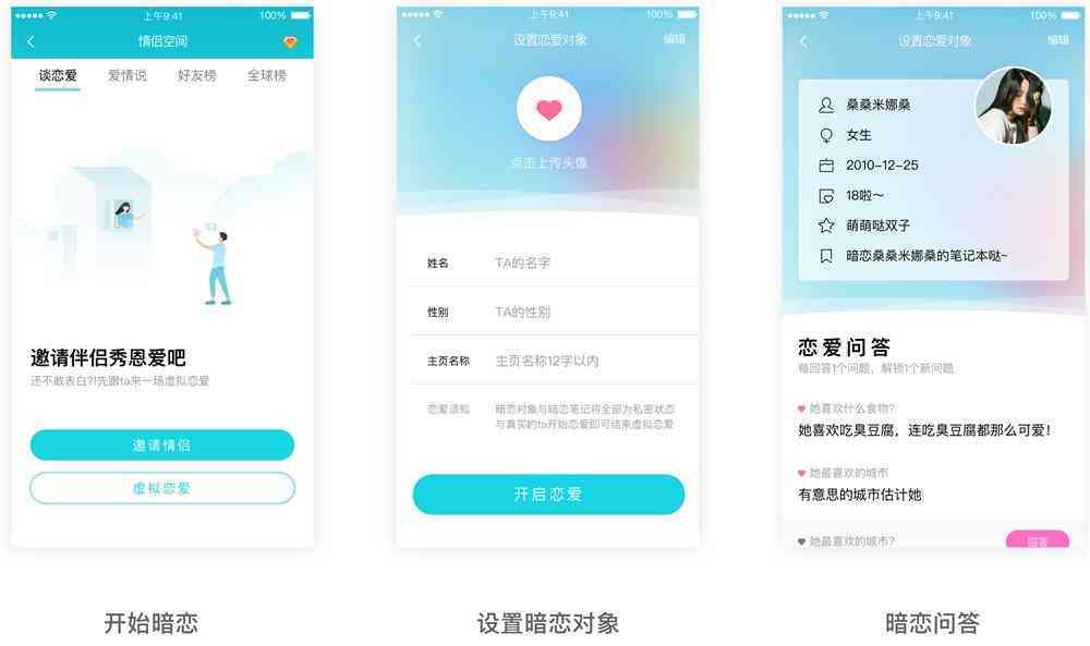 针对单身用户推出的暗恋笔记本功能,用户可开通与暗恋对象的虚拟情侣空间,你不仅可以在里面记录关于 Ta 的一切和你的心情,还有 AI 智能对话功能帮助你记录一个立体的 Ta。