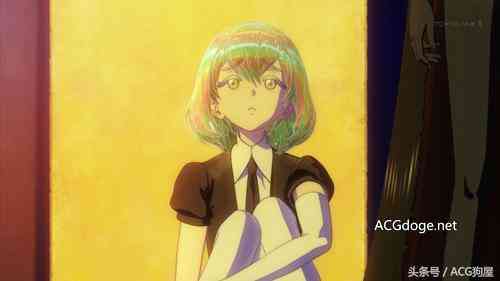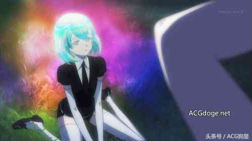 2016 年 6 月时制作的测试卡画面,测试卡画面中是 CG 制作的草与美术背景画面相结合,此时出现的钻石制作设想是有着虹色头发的磷叶,测试卡制作时月人的表现手法还没确定,最后播出的动画正式版是在测试卡的基础上再加入了一些效果。