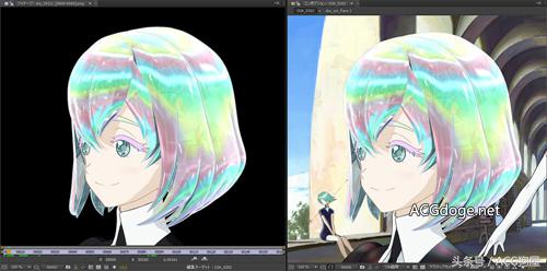 最开始在磷叶外形制作测试的时候,团队打算在头发方面使用多个素材来组合拼装表现,但考虑到减少后续工序的制作负荷,就没有采用多素材组合的制作方式,在《宝石之国》动画中观众看到的角色晶莹剔透有着宝石质感头发,几乎就是完整一个单独素材,左图是渲染时的钻石头发,右图是最后动画中钻石的外形,两者之间几乎没有太大差别。团队在允许的范围之内限制了头发的发射与折射缩短了渲染工序的时间。