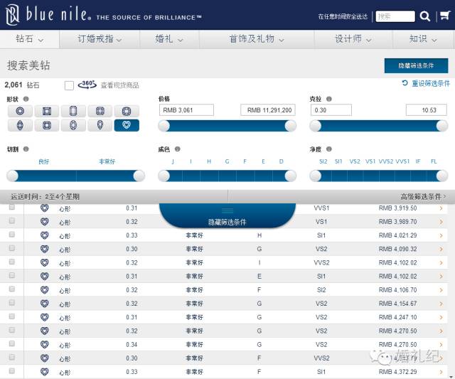 另外小犀还想提一下圆钻和异形钻。买钻戒新娘们多选择常规的圆钻,认为圆形钻显大,升值快。但其实这是个误区。在同等标准下,50分圆钻的钱就能买到1克拉的异形钻!基本50分的圆形钻戒价格大概在1w-3w之间,而bluenile(国际知名在线钻石珠宝零售商)官网上,异形钻的价格,50分的心形钻大概在5000-15000之间。