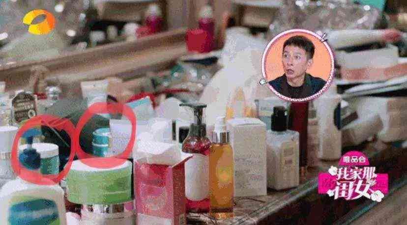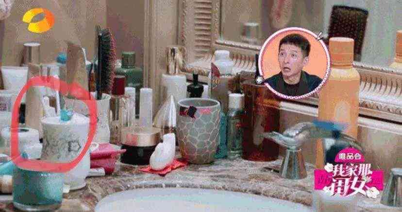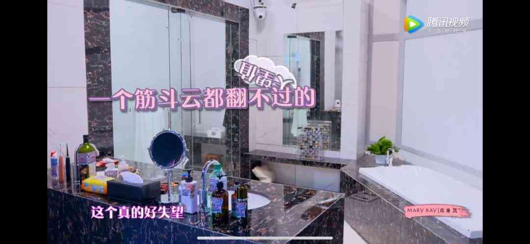 没错就是她压腿的这个台子,一模一样的酒店式大理石装修风格,台面上摆的化妆品也没有太大改变,就是换换洗面奶而已嘛,谁的洗面奶不是总换呢。