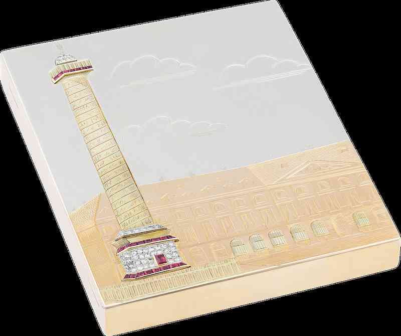比如在时间-巴黎展厅内,可以看到一件1946年生产的由白K金、黄K金和玫瑰金打造的雅致烟盒,将巴黎的芳登广场优雅荟萃于一方天地之中。而在时间-轻展厅内,一件宛若领结丝巾的红宝石钻石项链尤为轻柔动人。这件项链创作于1936年,由三串枕形切割红宝石和长方形切割钻石组成。在项链的每一面,都可以领略到从钻石缎带所展现出的一种风格化对称设计,这是向装饰艺术运动的几何线条致敬。