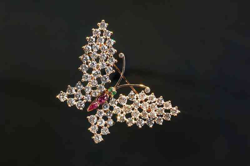 梵克雅宝的珠宝作品风格确实是很明显的,只要走过一遍展览,大部分观众都能发现,有几大主题是梵克雅宝钟爱的。一则是自然,花鸟虫鱼这些具象的、精巧的自然形象是最常见的主题。二则是时装元素,梵克雅宝源自高级定制之都巴黎,因而你会看到很多以珠宝模仿丝带、蕾丝、编绳、薄纱等等柔软时装配件的作品。三则是想象力,或者说叙事性,梵克雅宝经常从一些富有想象力的童话、小说、话剧中获取灵感,用珠宝讲述这些动人的故事。这此次的展览中,你可以在时间展厅里看到很多童话相关的作品,包括仙子胸针、独角兽胸针等等。
