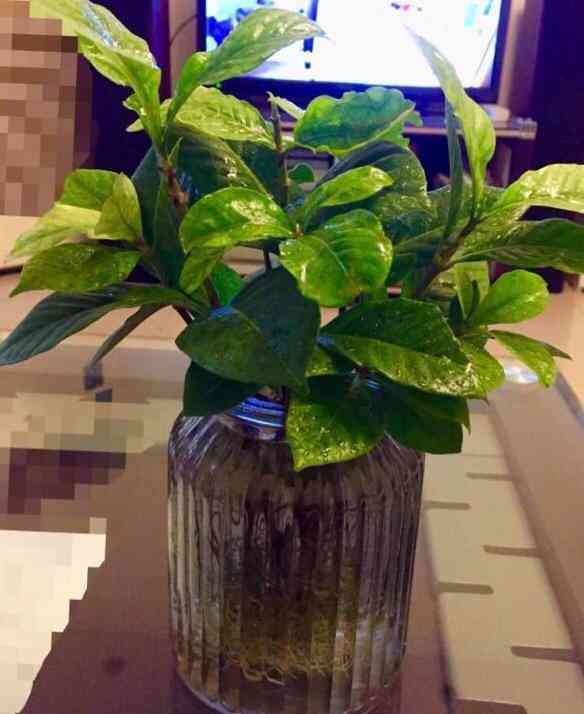 吃完罐头的瓶子没有舍得扔,洗洗干净,装上清水,掐几根栀子花枝,插进去后,美美滴,放在散光通风的地方,长了很茂盛的根哦,叶子也绿油油的!