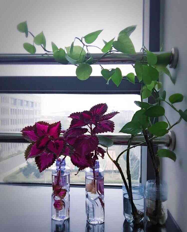 看我水培的彩叶草,和绿萝,几个普通的矿泉水瓶子,上端部分剪掉,绿萝长的老长了,是不是别有一番味道?