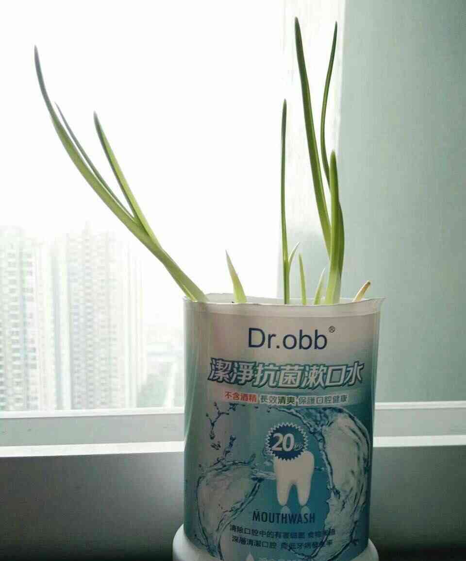 漱口水的盒子,装了点土,把几根蒜头种进去,陆续长出苗来,亭亭玉立啊。