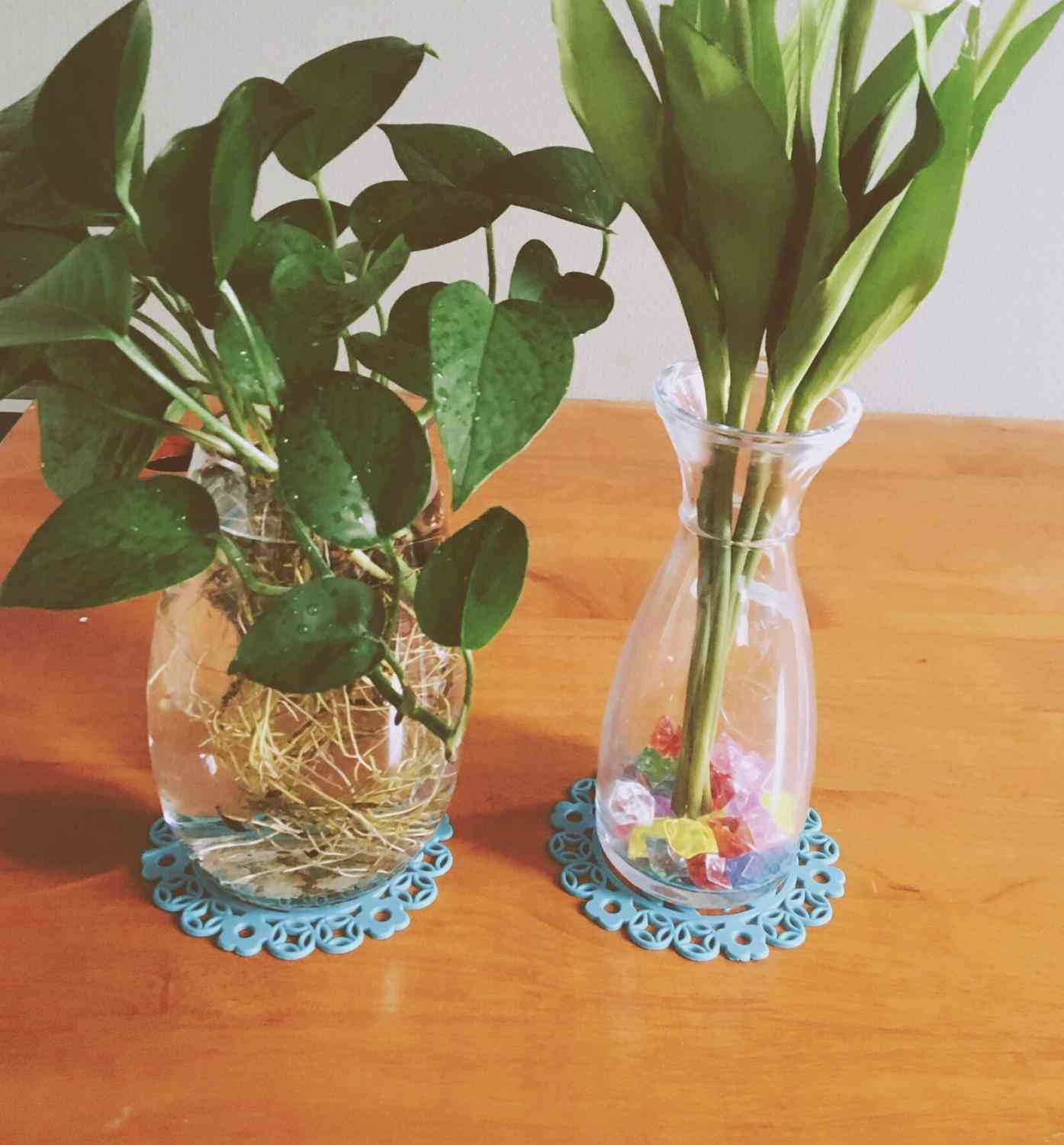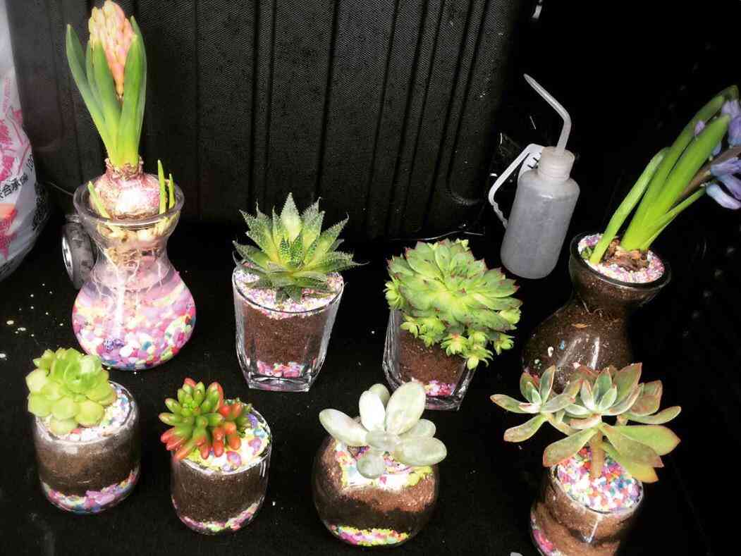 那些很少用的小玻璃杯,布丁杯子,装上土,和彩色石子,种几棵普通又皮实的多肉植物,看起来挺阔爱的呀。