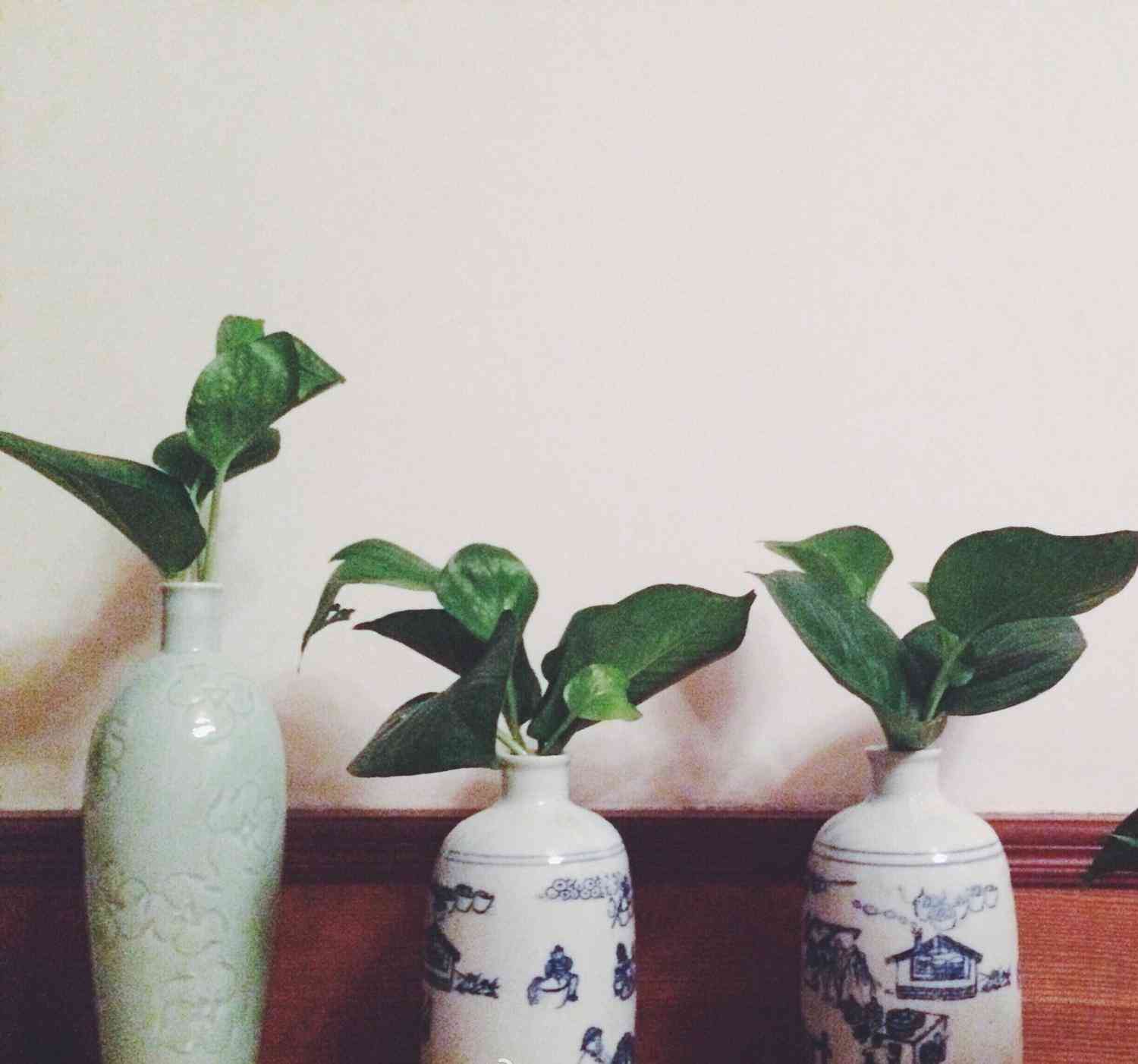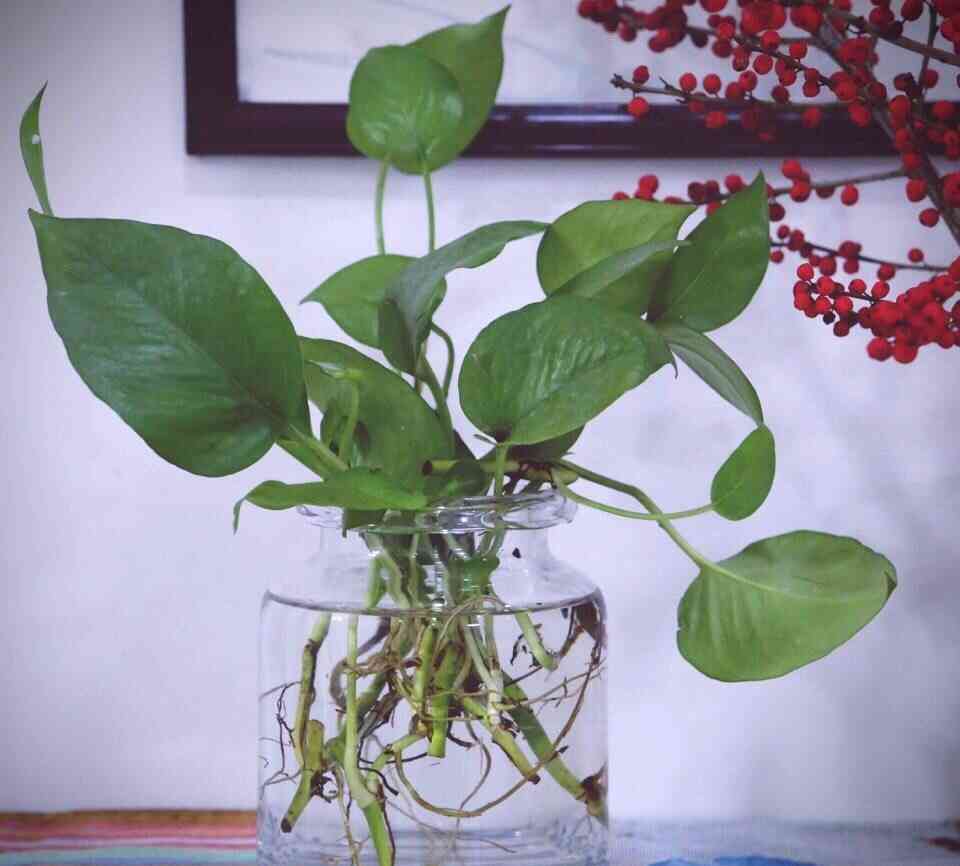 这种普通的空酒瓶,平时都扔掉了,用来水培几个绿萝枝子,是不是看起来也挺合适的呀。