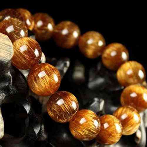 钛晶发丝呈较粗的针状或板状极罕有的,即发丝粗密感觉象板块状,含针状或板状矿物质钛之发丝,钛晶氧化后呈闪亮的金色(有些珠子还会含有极少的棕黑色发头矿物质),通常颜色上钛晶感觉要深黄一些更金色一些,而发晶颜色浅一些。