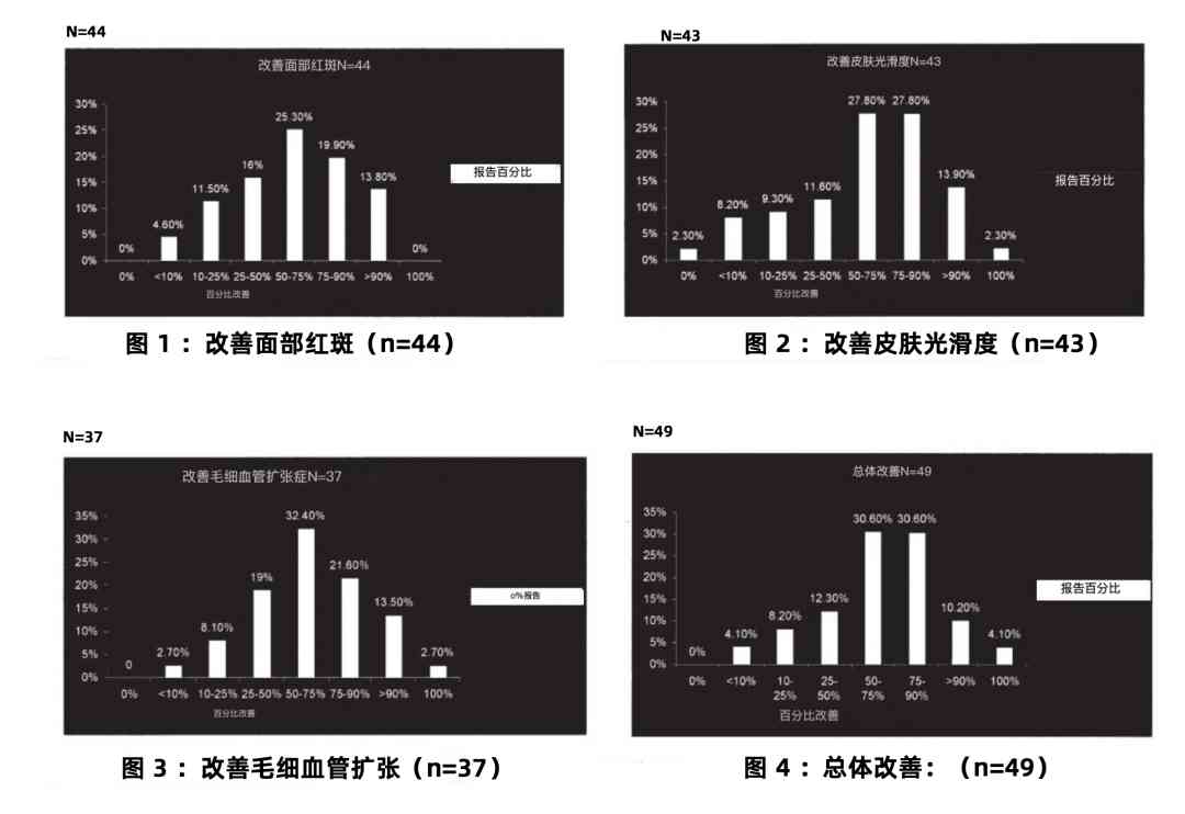 根据相关研究,64% 的受试者报告细纹改善至少25% 或以上;46% 的受试人报告细纹好转 50% 或以上;18% 的受试人员报告皱纹改善 75% 或以上[12]。
