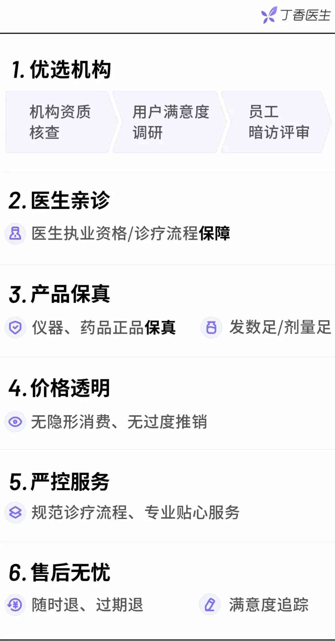 为了帮助更多的用户安心搭乘医美这辆车,丁香医生优选三正规机构为你把关,更有以下服务保障。